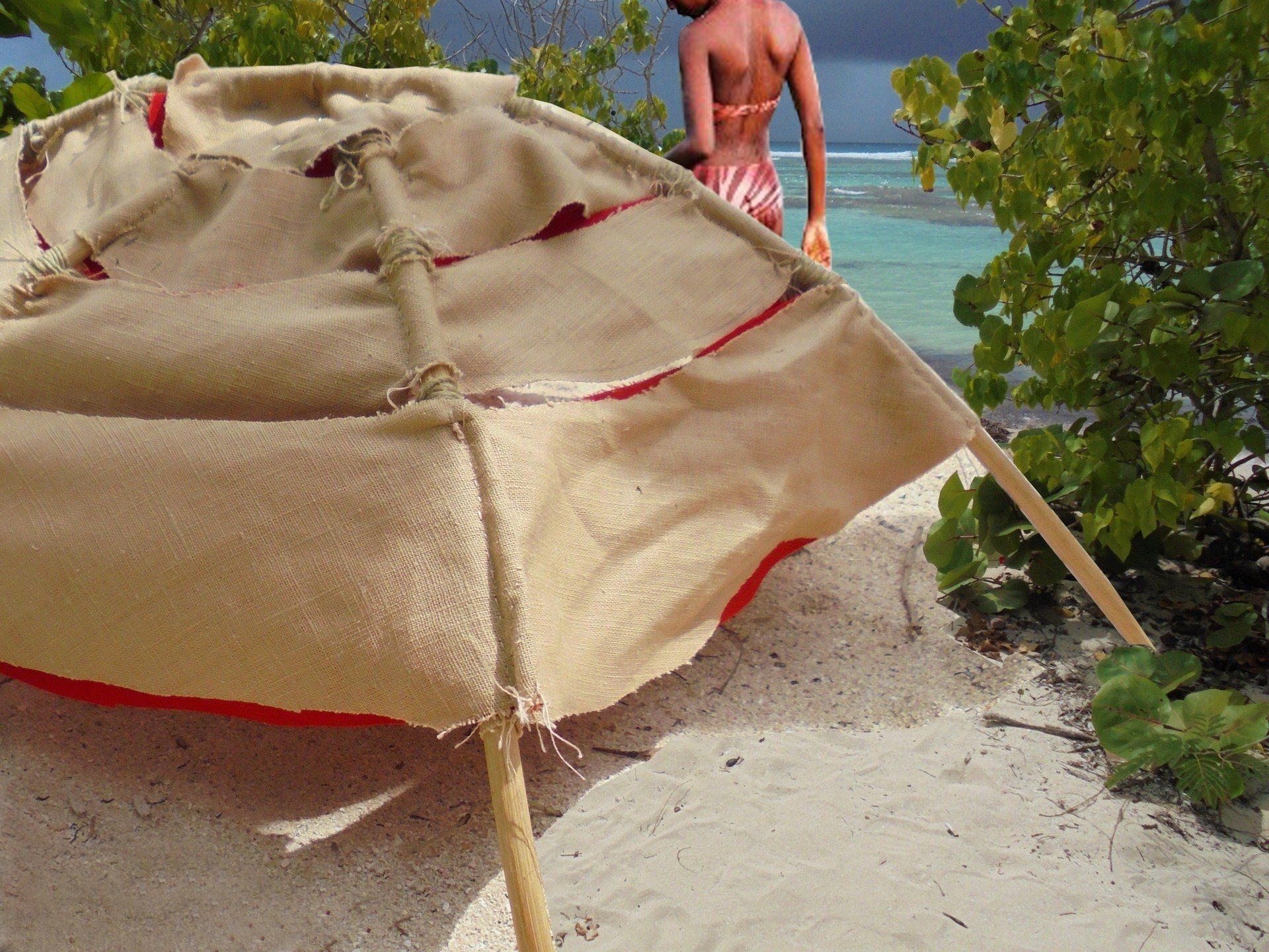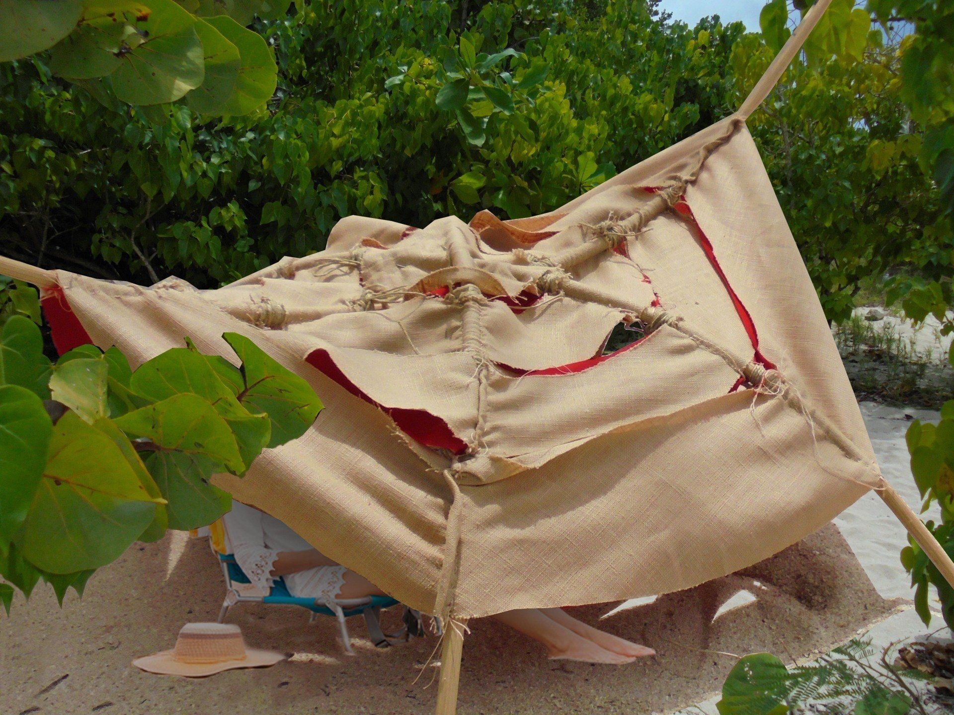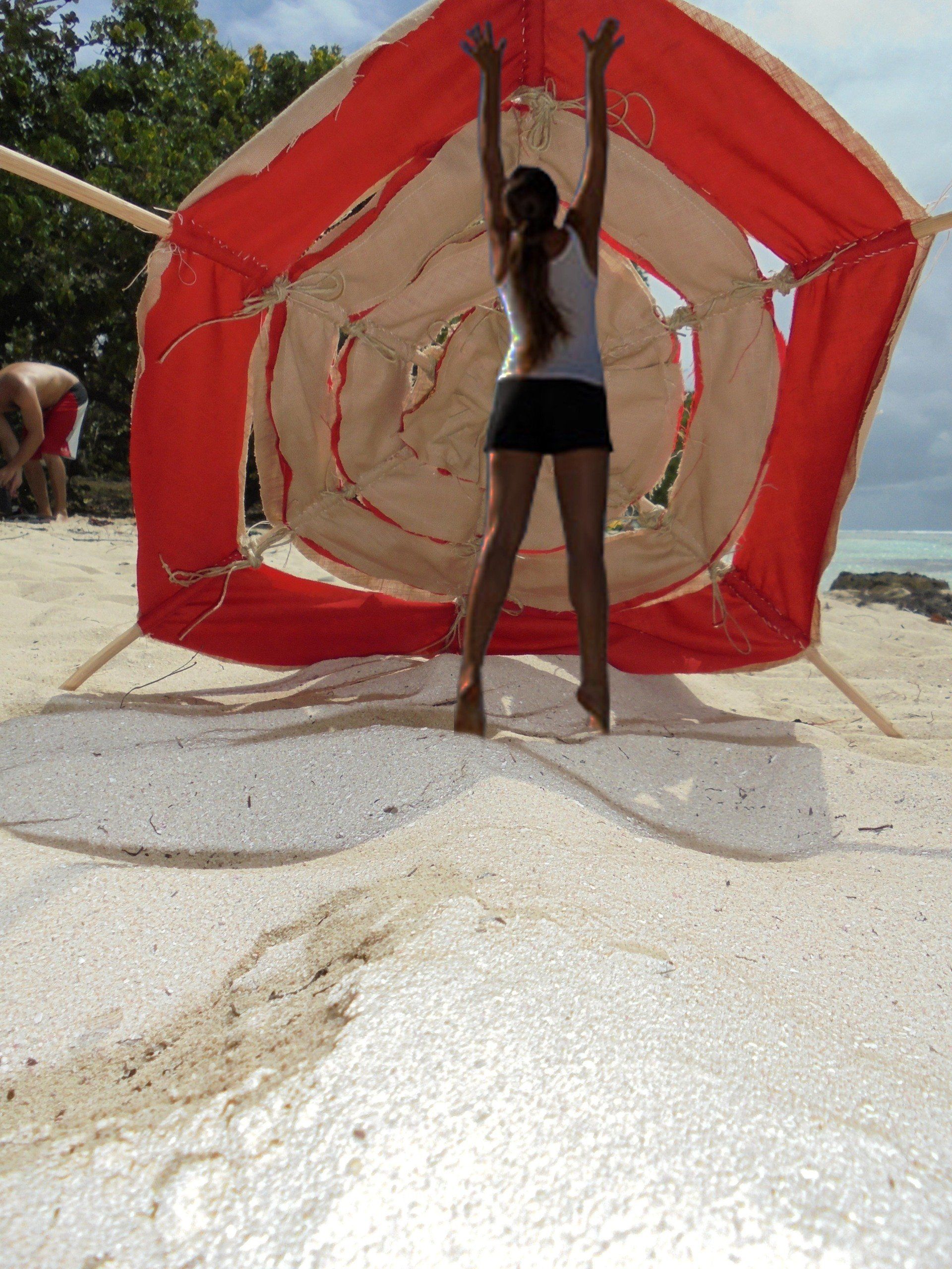 Revêtu d'un textile imperméable, sa structure joue à la fois avec l'ombre et la luminosité du soleil toute en se laissant traverser par les alizés.